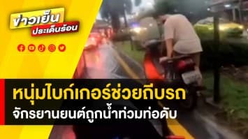 น้ำใจคนไทย ! หนุ่มไบก์เกอร์ช่วยถีบรถ จักรยานยนต์ถูกน้ำท่วมท่อดับ