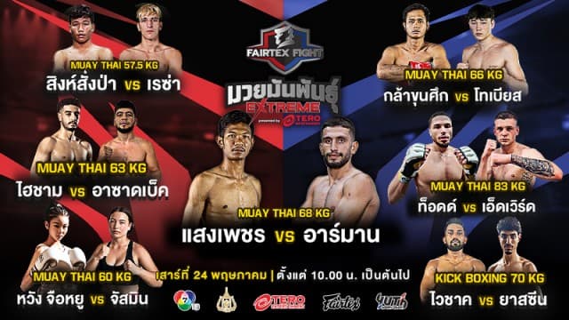 สังเวียนเดือด! เปิดชื่อ 7 คู่กำปั้นโหด “แสงเพชร vs อาร์มาน ” นำทีมลุยศึก “Fairtex Fight มวยมันพันธุ์ EXTREME” เสาร์ที่ 24 พฤษภาคมนี้
