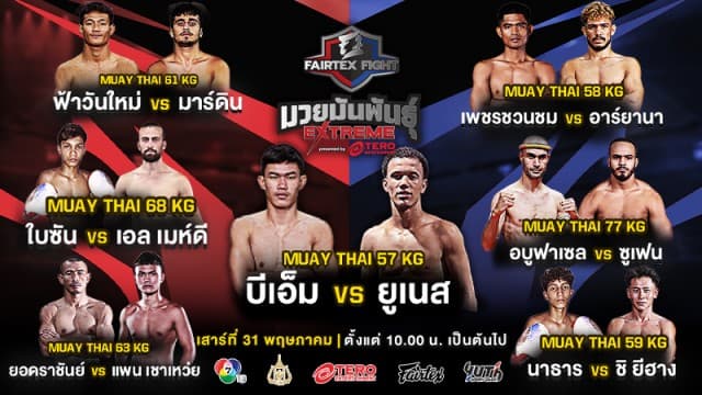เดือดส่งท้ายเดือน ! เปิดชื่อ 7 คู่กำปั้นโหด “บีเอ็ม vs ยูเนส” นำทีมลุยศึก “Fairtex Fight มวยมันพันธุ์ EXTREME” เสาร์ที่ 31 พฤษภาคมนี้
